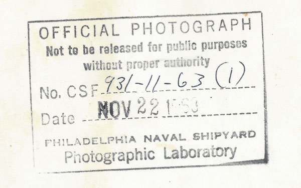 I have an official photograph. It was taken inside a computing facility at the Philadelphia Naval Shipyard. The back is stamped by the PNSY Photographic Laboratory and marked “not to be released for public purposes without proper authority.” The date on that stamp is November 22, 1963.